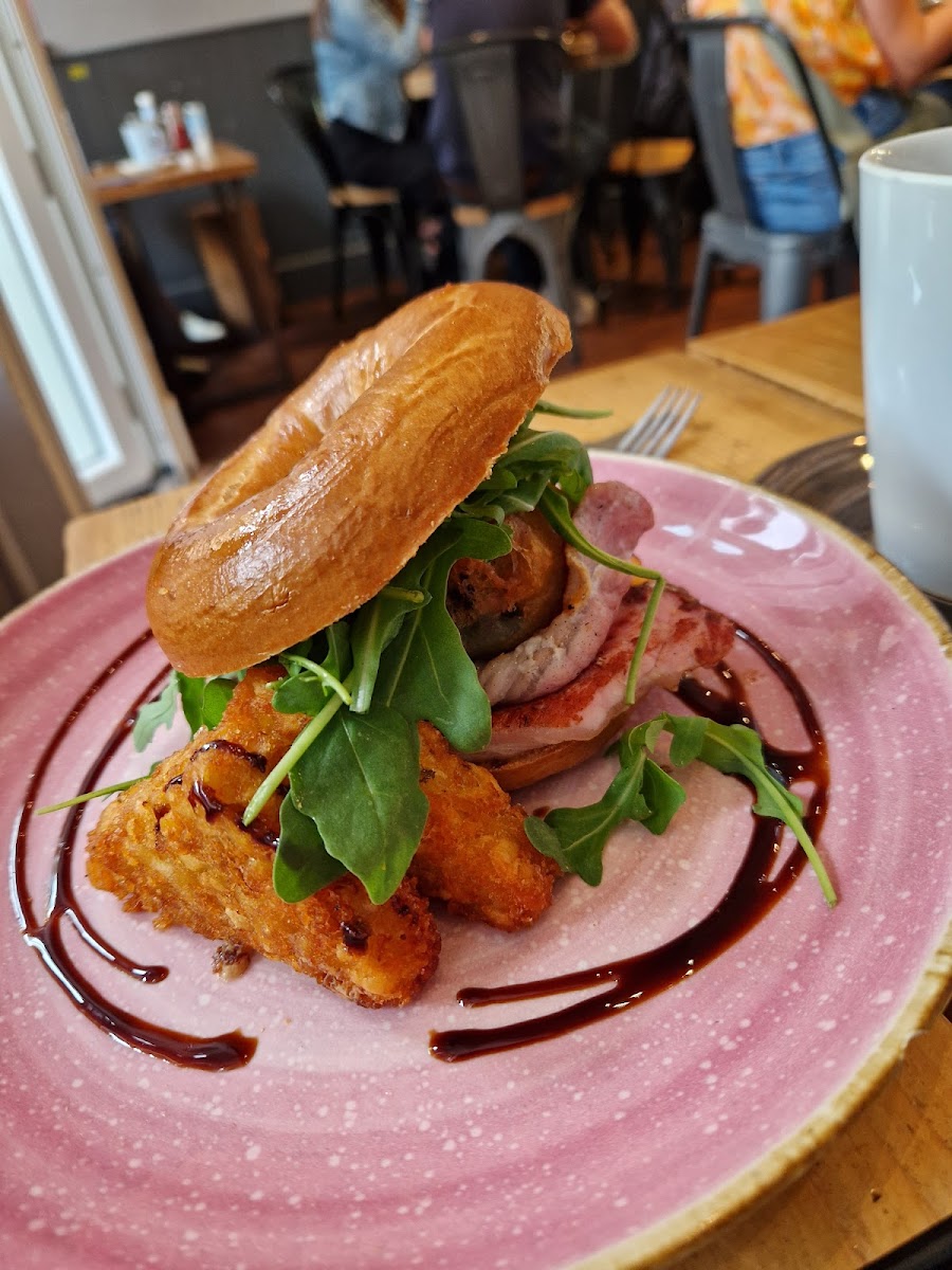 Bacon & Avocado Tempura Bagel with Hash Browns